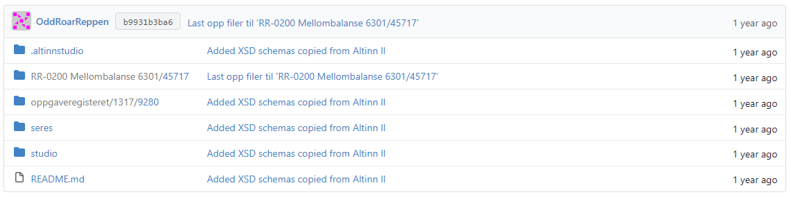 I tillegg vil du se en readme.md fil som vises på forsiden av repository. Denne inneholder en tekstlig beskrivelse av alle XSD’ene som er hentet ut fra Altinn 2.