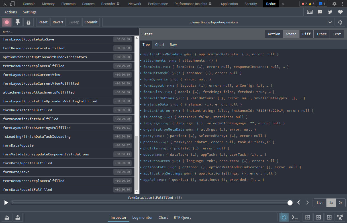 Go to the Redux tab in your developer tools. It should have auto-selected your application instance, and it should look similar to this: