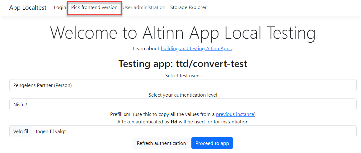 If you have a development version of the frontend application running locally, or you want to test specific/earlier versions of the frontend application, this can be done by switching the frontend version using the link on the bottom when first visiting local.altinn.cloud: