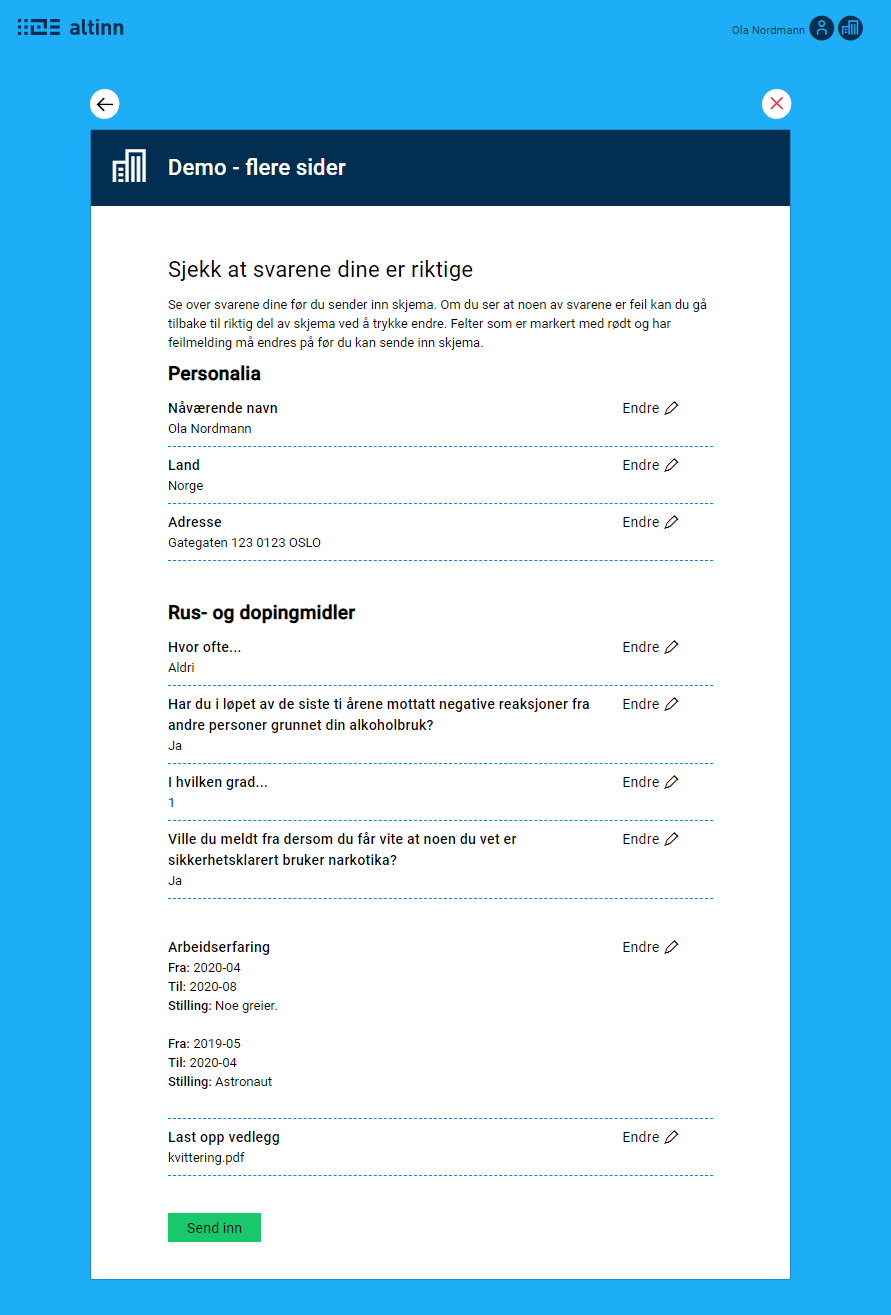 Below is an example of a summary page, with setup in the layout file. Since the summary is set up in the layout files in the same way as other components, you can also include other form components as texts when needed.