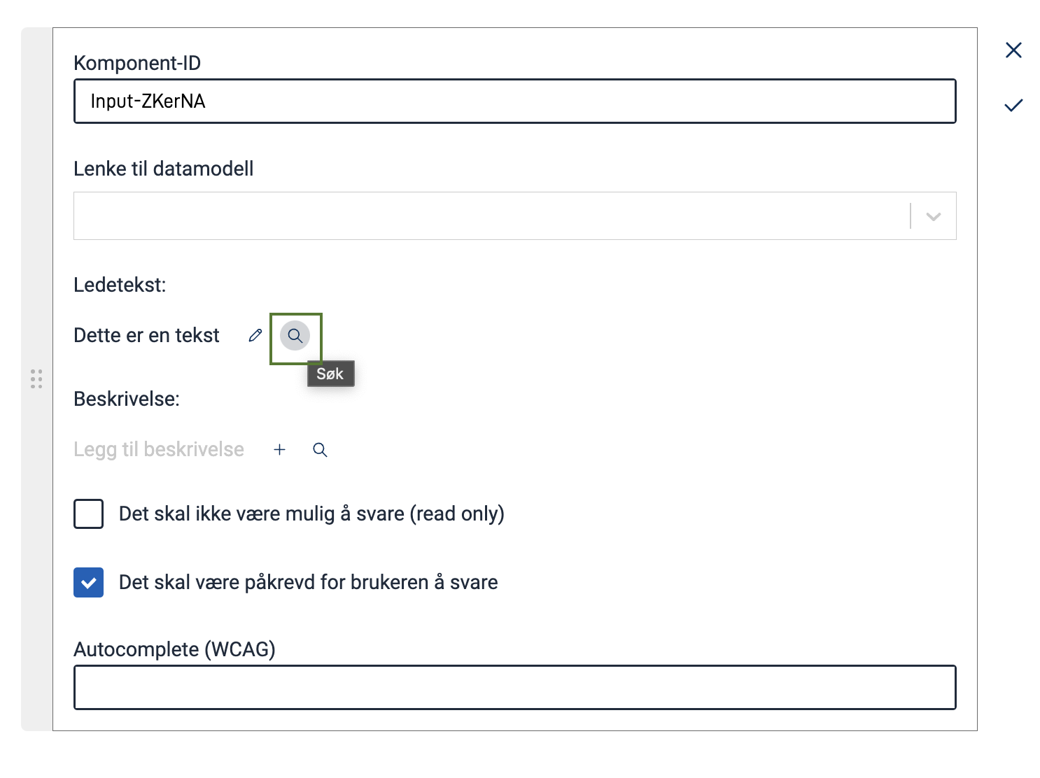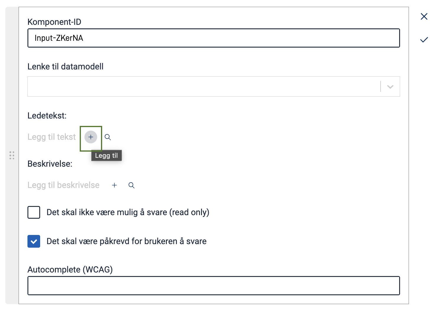 By definingdataModel.<dataModelNavn>as the data source you can fetch values from the fields in the form that the user is filling out. Data can be fetched from fields regardless if they are visible or not. If the user changes data in a field referenced in a variable, the text will be updated when the user stops typing in the field. - Application Settings