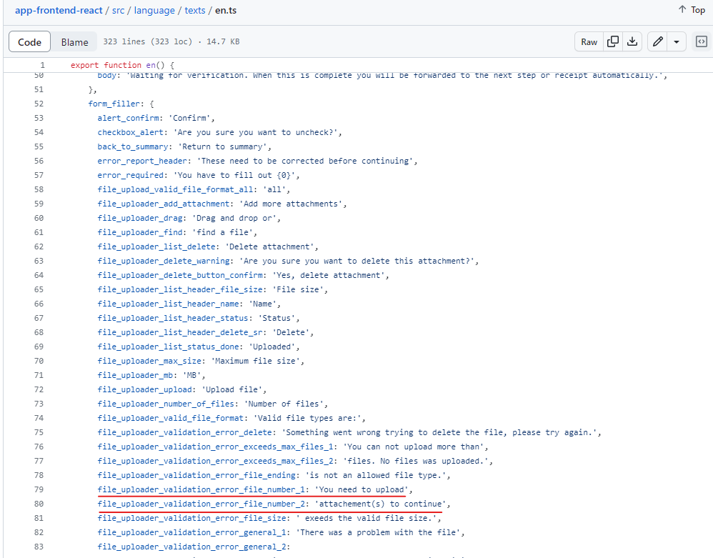 It is possible to change the default texts and error messages that are displayed in the app. Here are the keys with its default value in English, Norwegian Bokmål and Norwegian Nynorsk