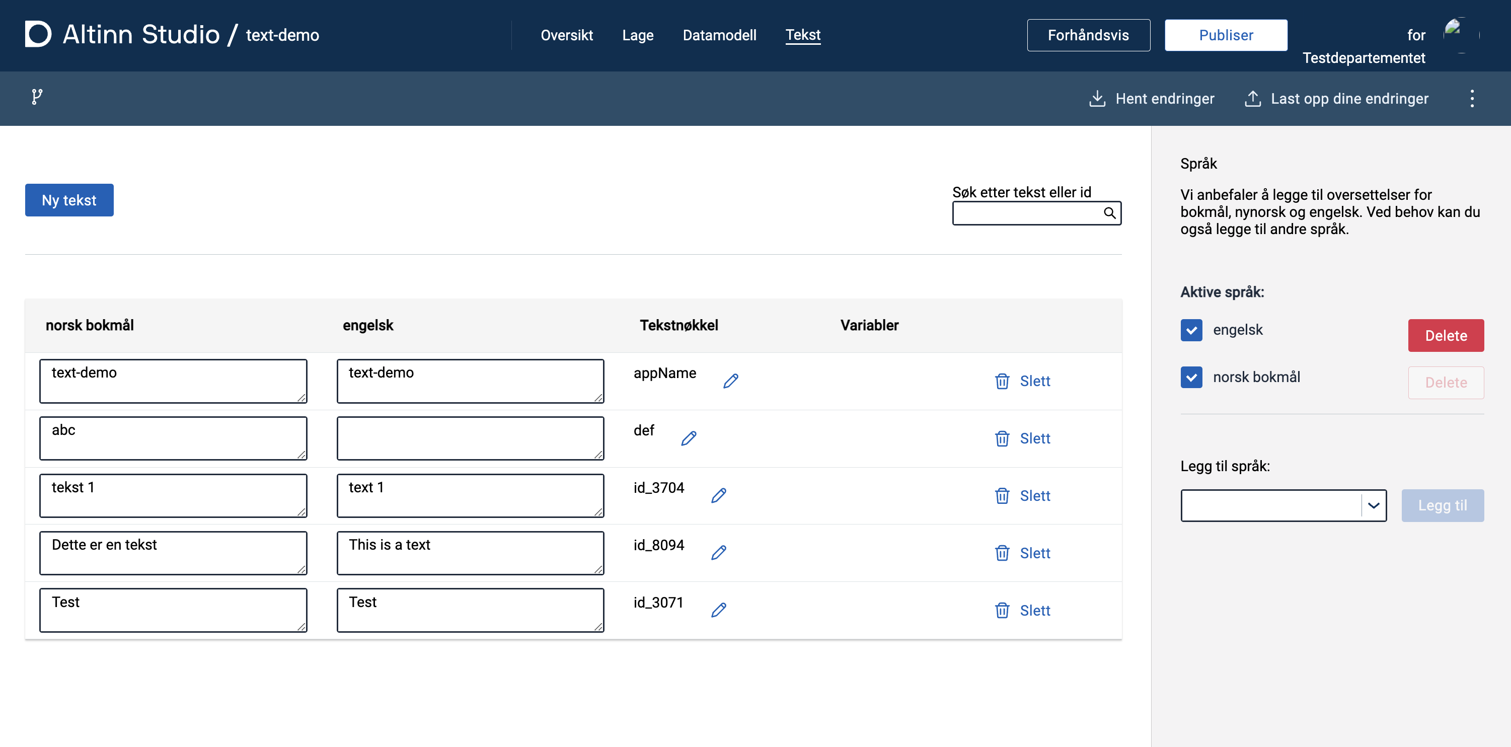 Texts can be edited locally, directly in the JSON-files, or via the Altinn Studio text editor.