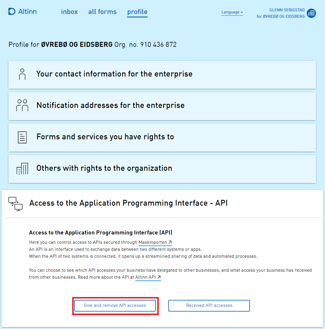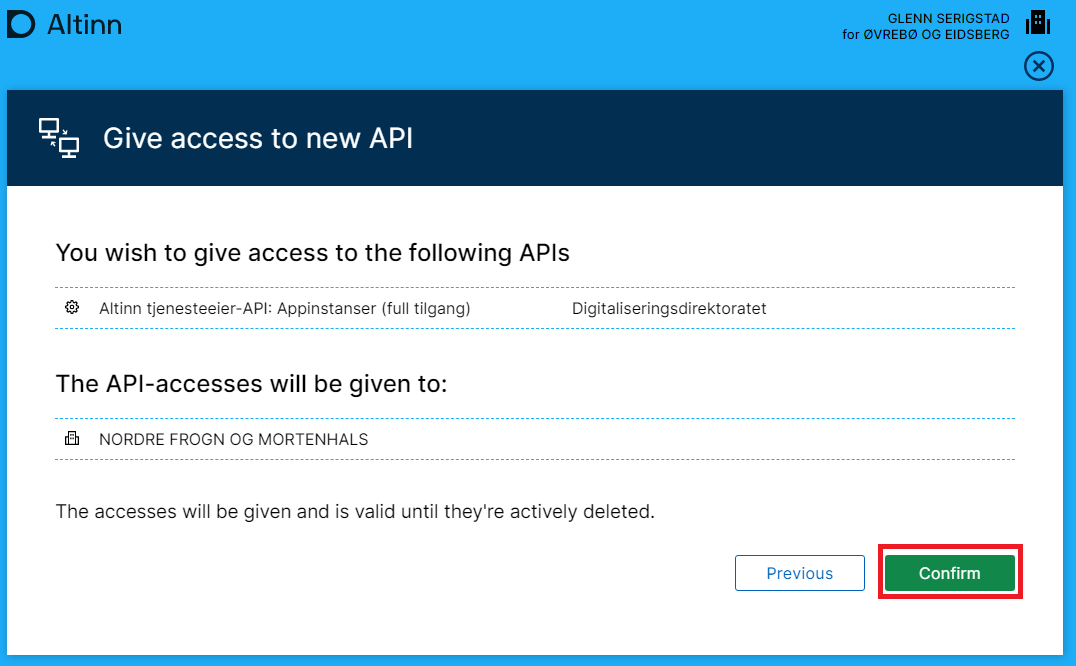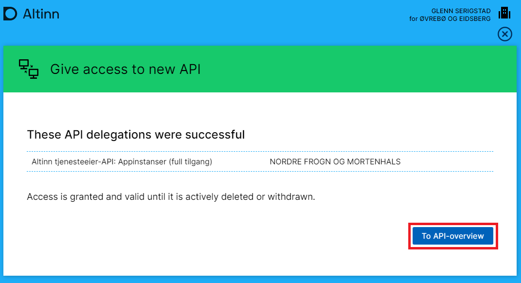 As a service owner key role user (typically general manager aka DAGL), open “Access to the Application Programming Interface - API”.