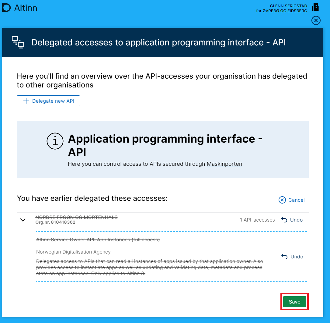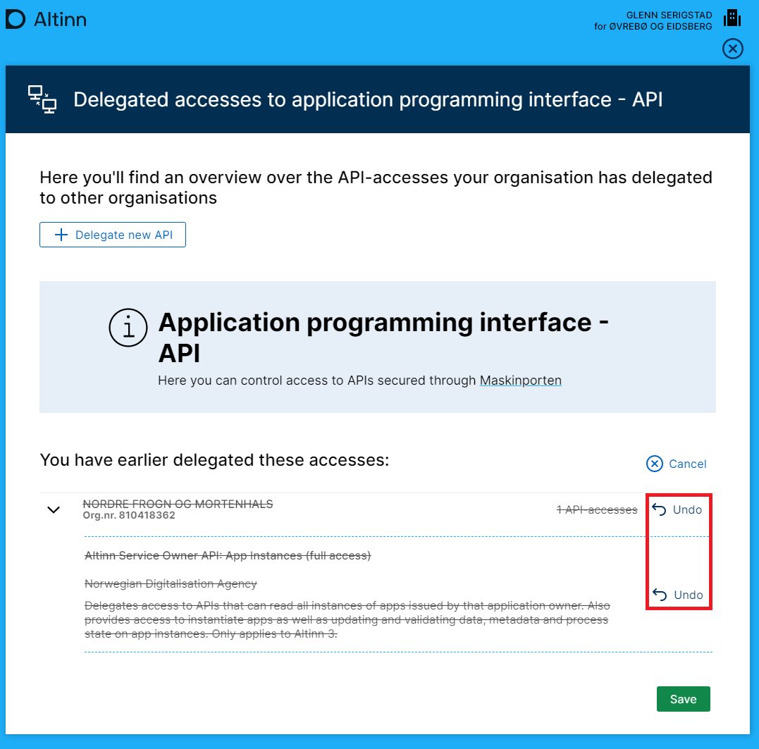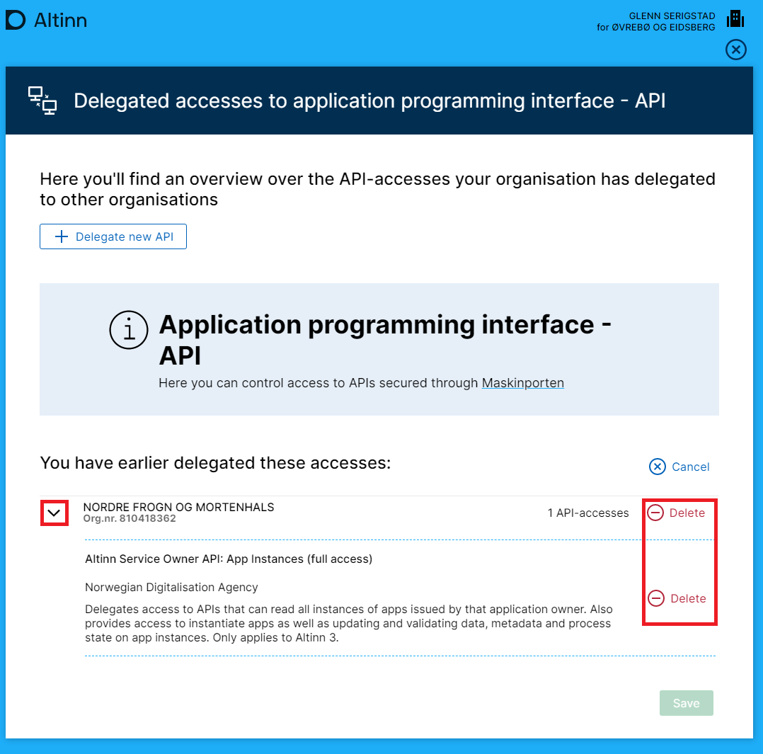 Delegations that have been made can also be removed. If a supplier no longer needs API access, it is the service owner’s responsibility to remove these.