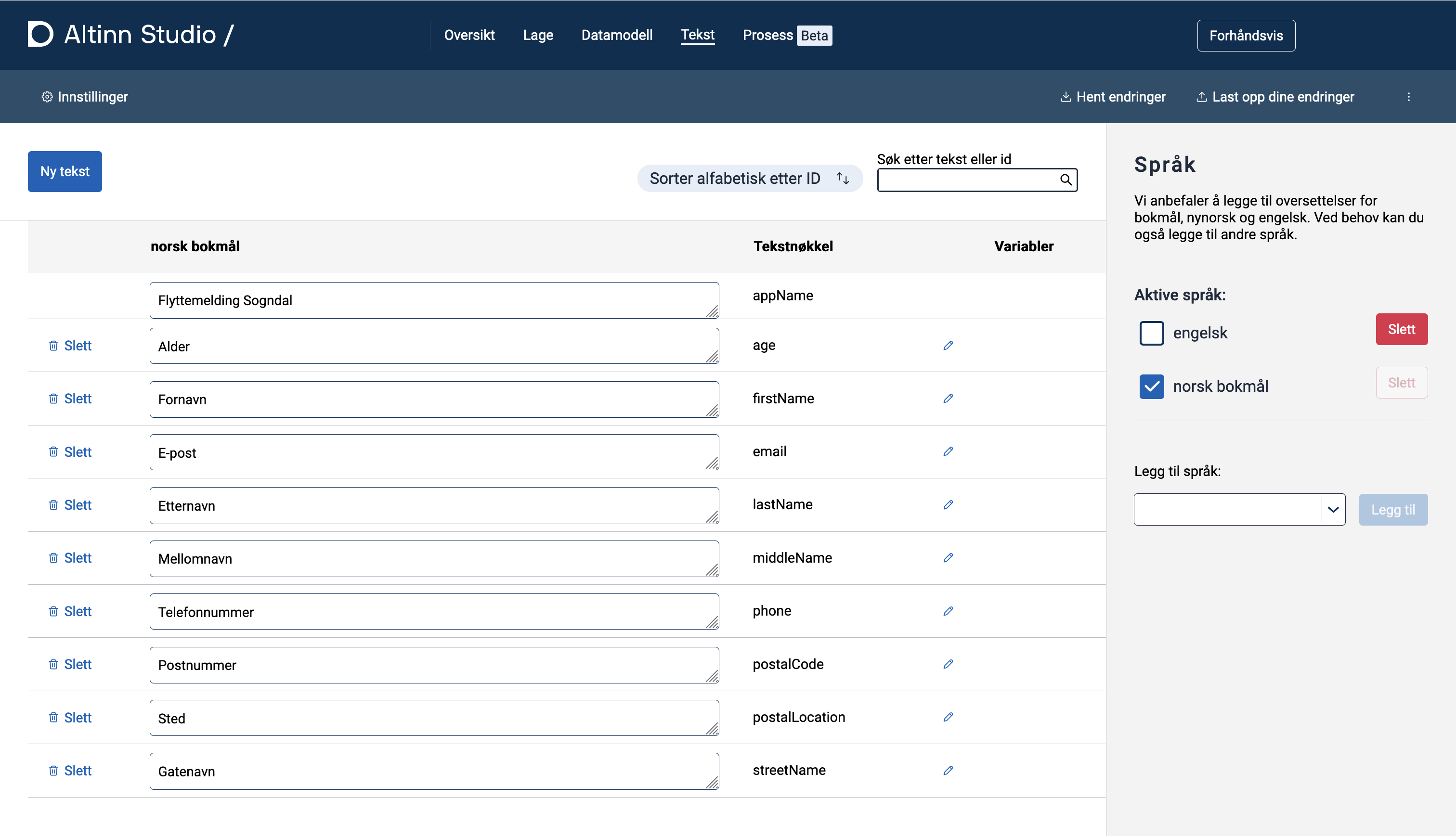 Texts in Altinn Studio are stored in separate language files (also called resource files) and can be linked to form components using a text key. The texts can be created and edited in Altinn Studio Designer or directly in the file.
