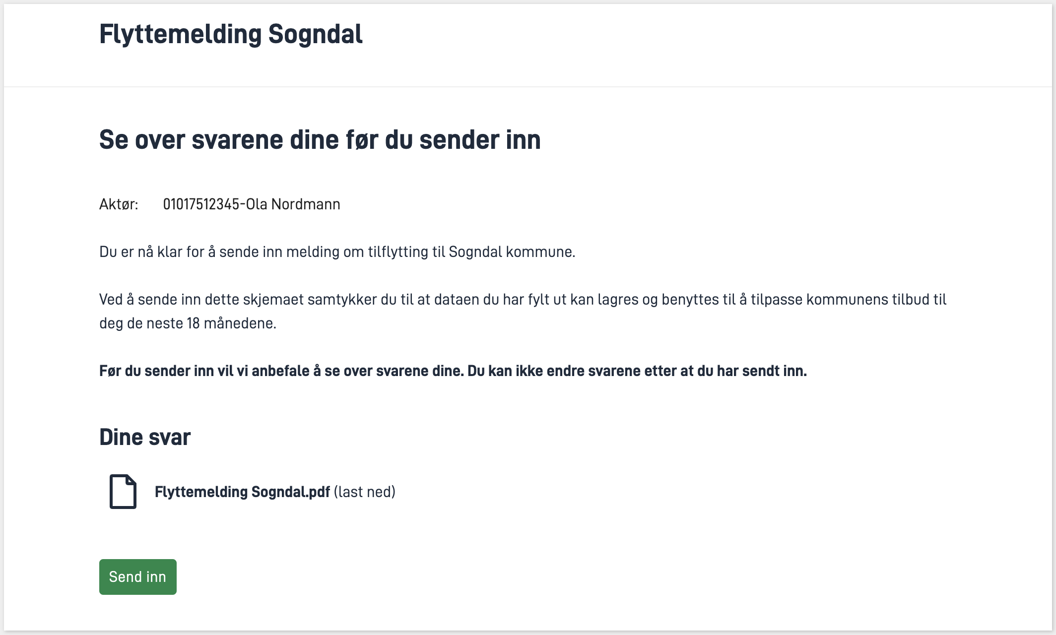 "value": "Du er nå klar for å sende inn melding om tilflytting til Sogndal kommune. </br></br> Ved å sende inn dette skjemaet samtykker du til at dataen du har fylt ut kan lagres og benyttes til å tilpasse kommunens tilbud til deg de neste 18 månedene. </br></br> **Før du sender inn vil vi anbefale å se over svarene dine. Du kan ikke endre svarene etter at du har sendt inn.**"