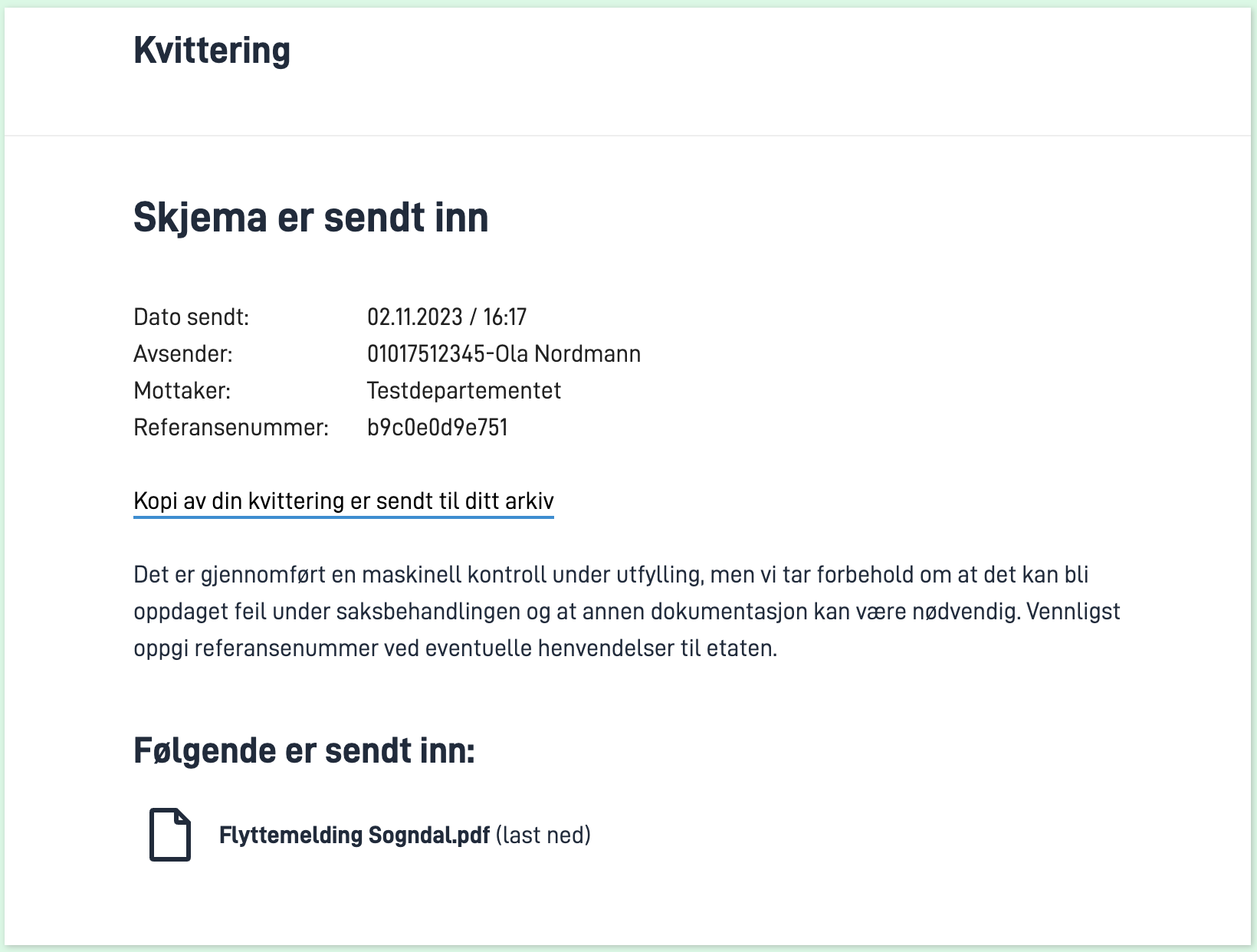 Please note that clicking “Send inn” (submit) on the confirmation page will result in an error message. This will be resolved in the next step with authorization.