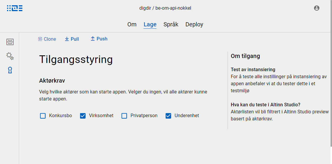 You can limit which actors have access to an app by using the Altinn Studio Designer. Role access options are placed in the “Lage” category in the top menu, on the page “Tilgangsstyring”, represented by the keyhole on the leftmost side menu. On this page you can mark the actor types the app should be accessible for. If none (or all) actor types are marked, everyone will have access. The option “Virksomhet” is used in cases where a report is filed on behalf of a company or other organization.