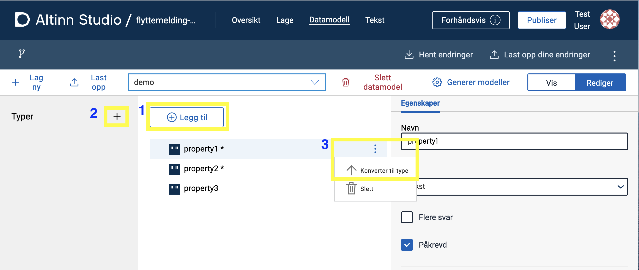 A field can be converted to a type by clicking the three dots to the right of the field and selecting “Konverter til type” (3 in below image).