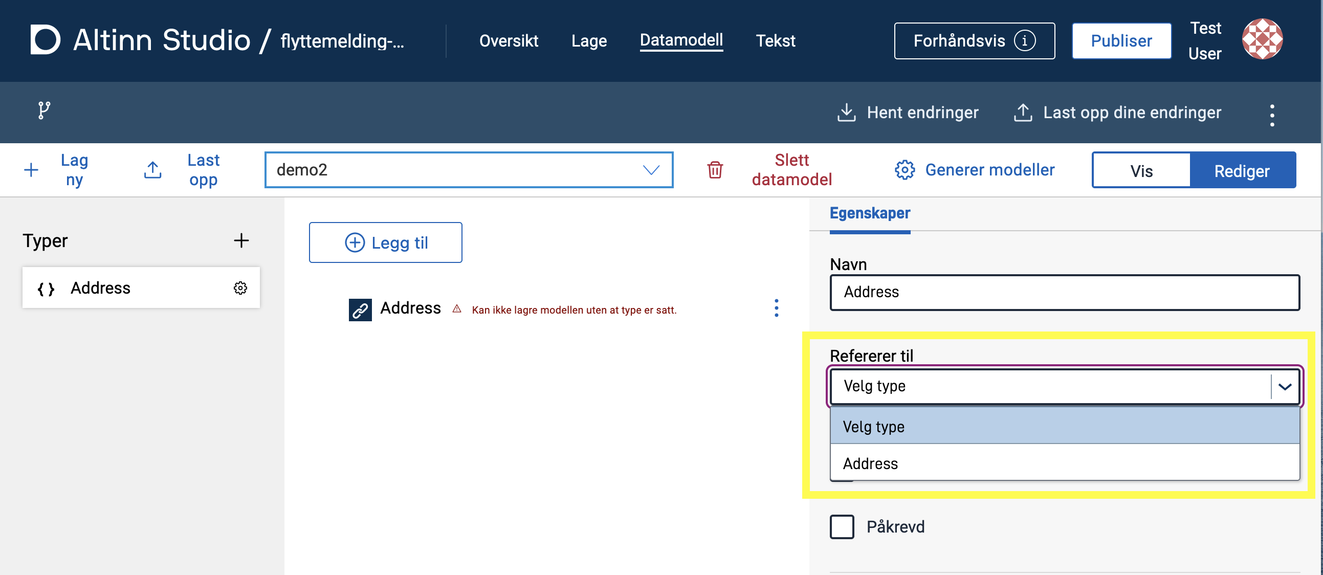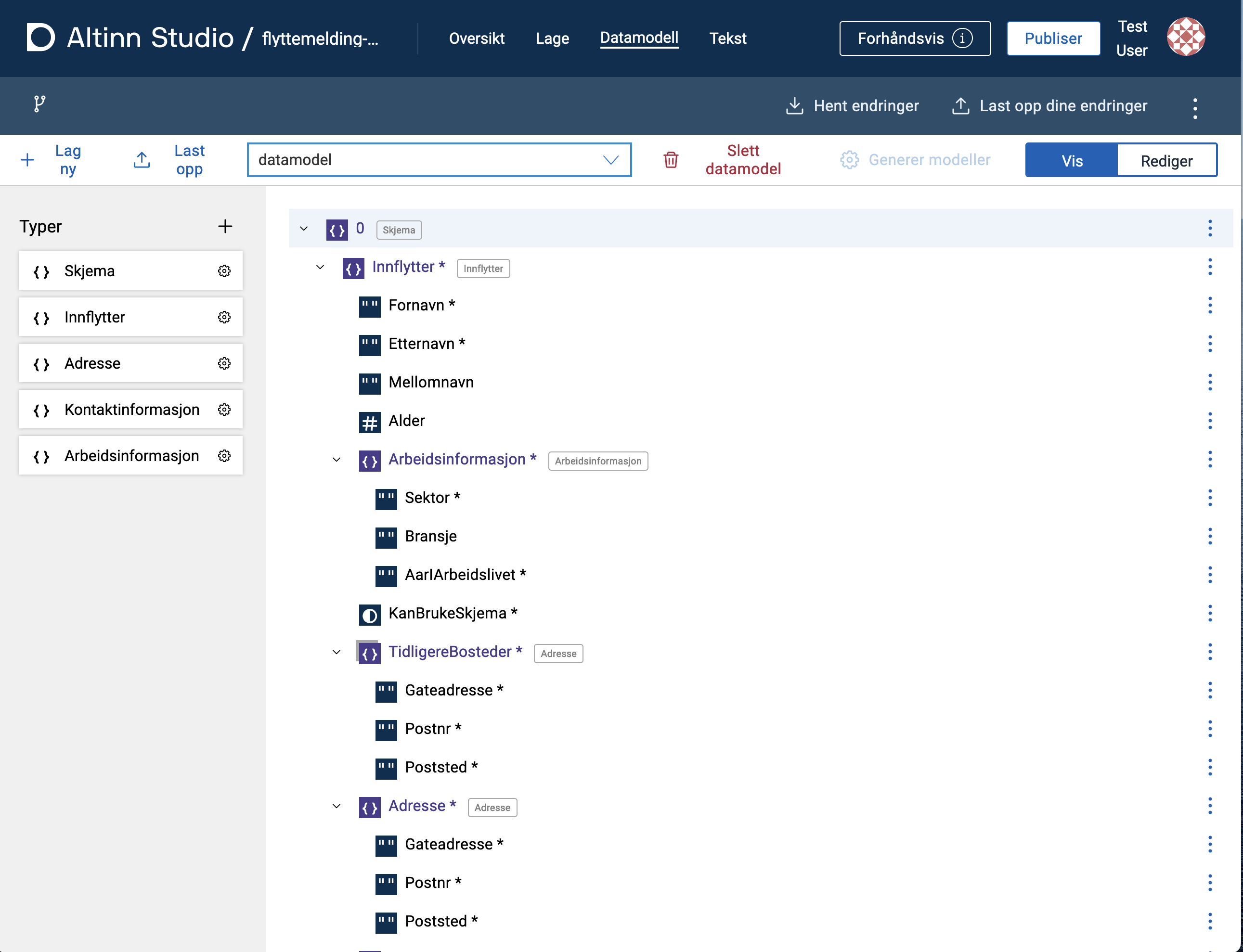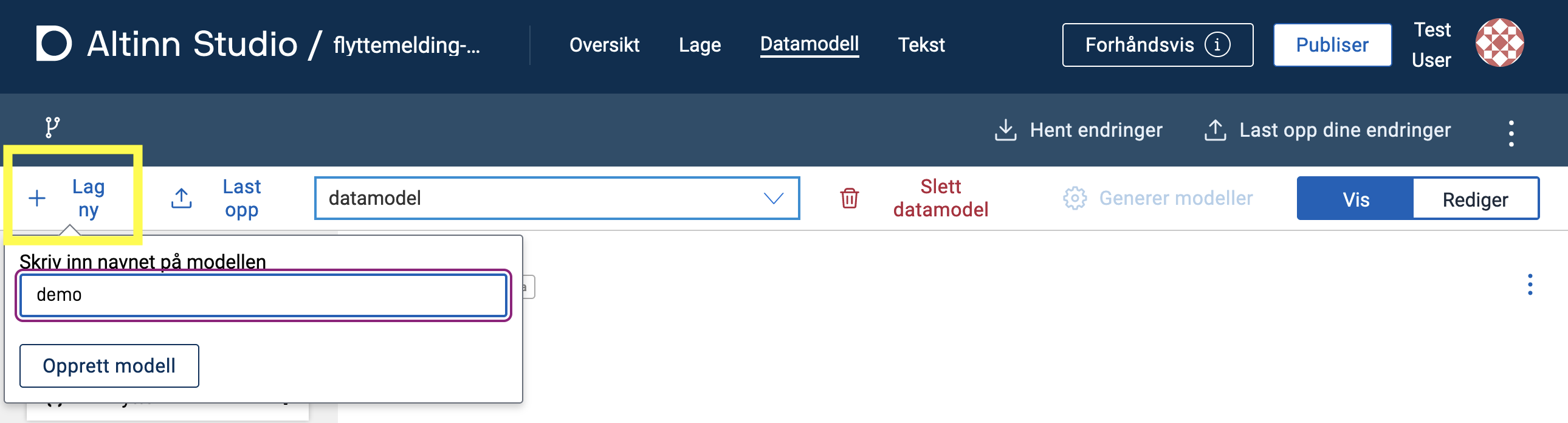 Remember to click Last opp dine endringer (Upload your changes) on the right side of the main menu in Altinn Studio to save your changes.