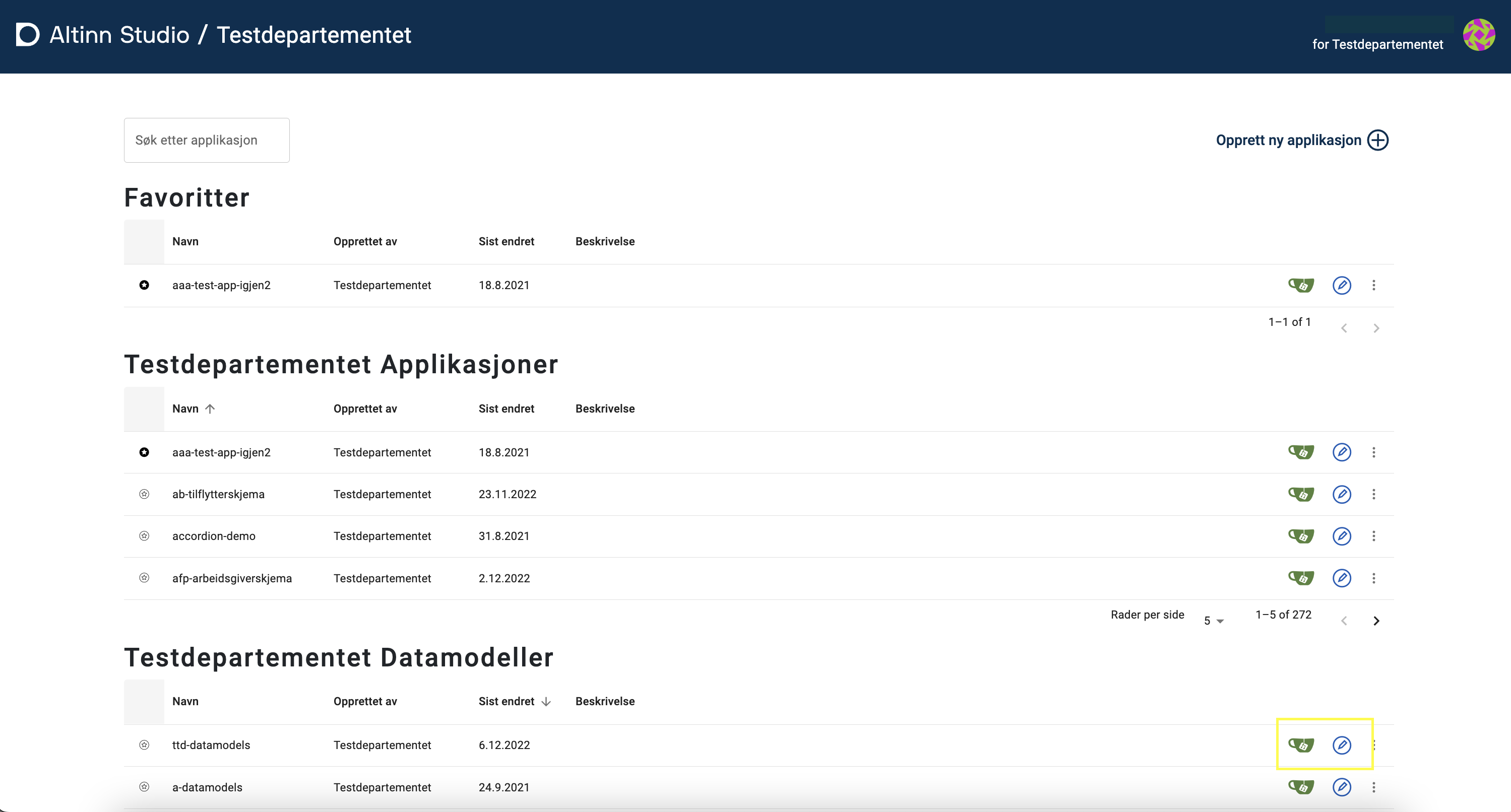 You can find the link to this repository in the Altinn Studio Dashboard: https://altinn.studio/dashboard. Select Edit (blue pen icon) to access the Altinn Studio Data Modeling tool. Select Gitea (green cup icon) to view the files directly in the repository.