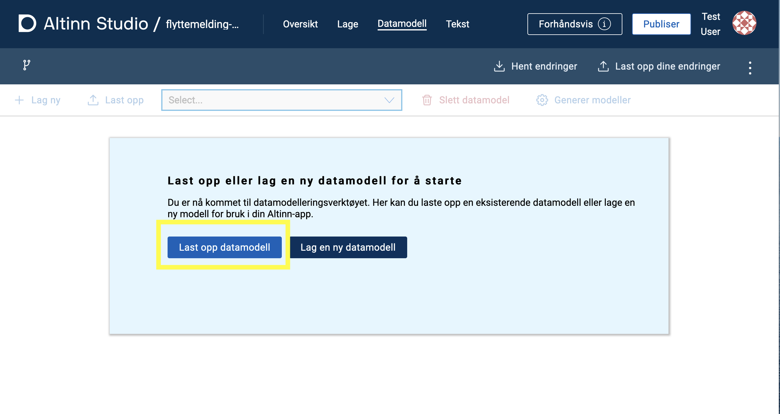 - Click Last opp datamodell (Upload Data Model) from the homepage if there are no existing data models or Last opp (Upload) from the toolbar at the top of the tool.