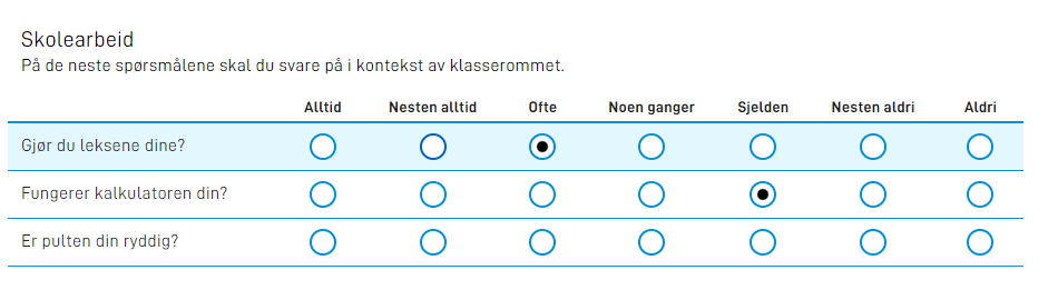 "description": "På de neste spørsmålene skal du svare i kontekst av klasserommet.",