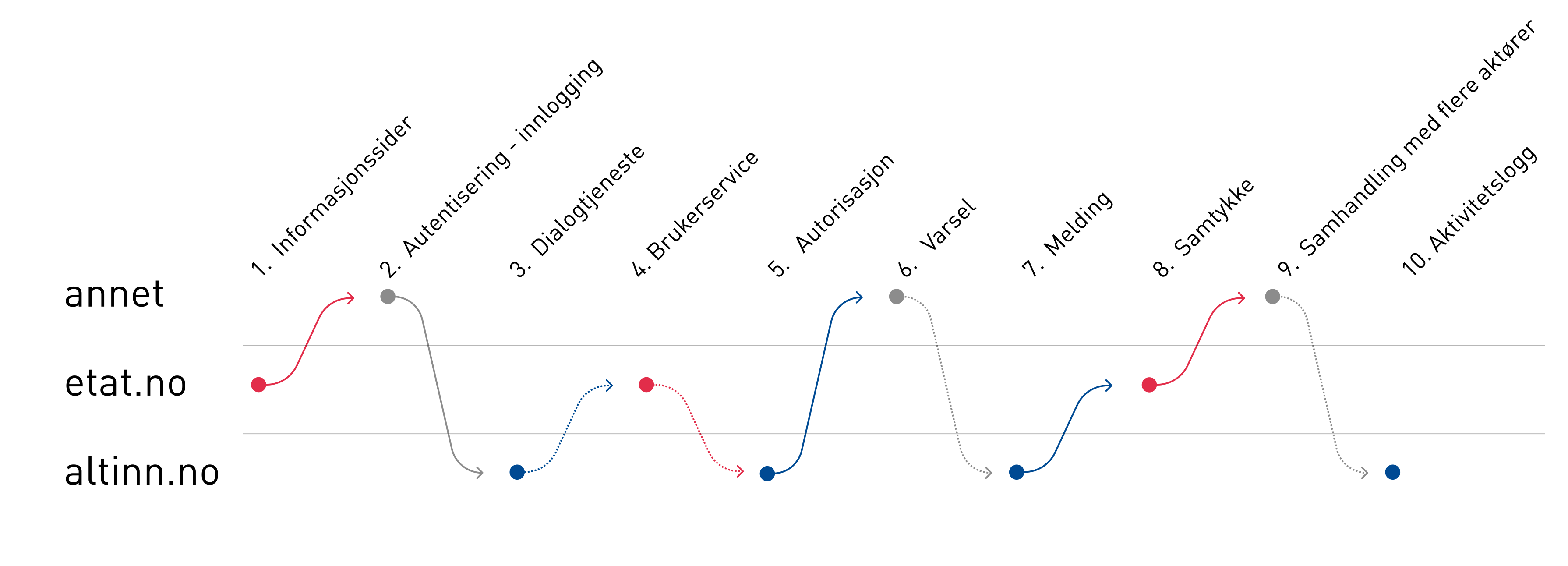 One way to do this is pictured below:Points of contactShould Altinn be hidden from the end user or will you be using Altinns internal UI? Does this match how the user expects to complete their task? Is it possible to offer the customer the relevant part of Altinn in the context they are in, instead of sending them back and forth?