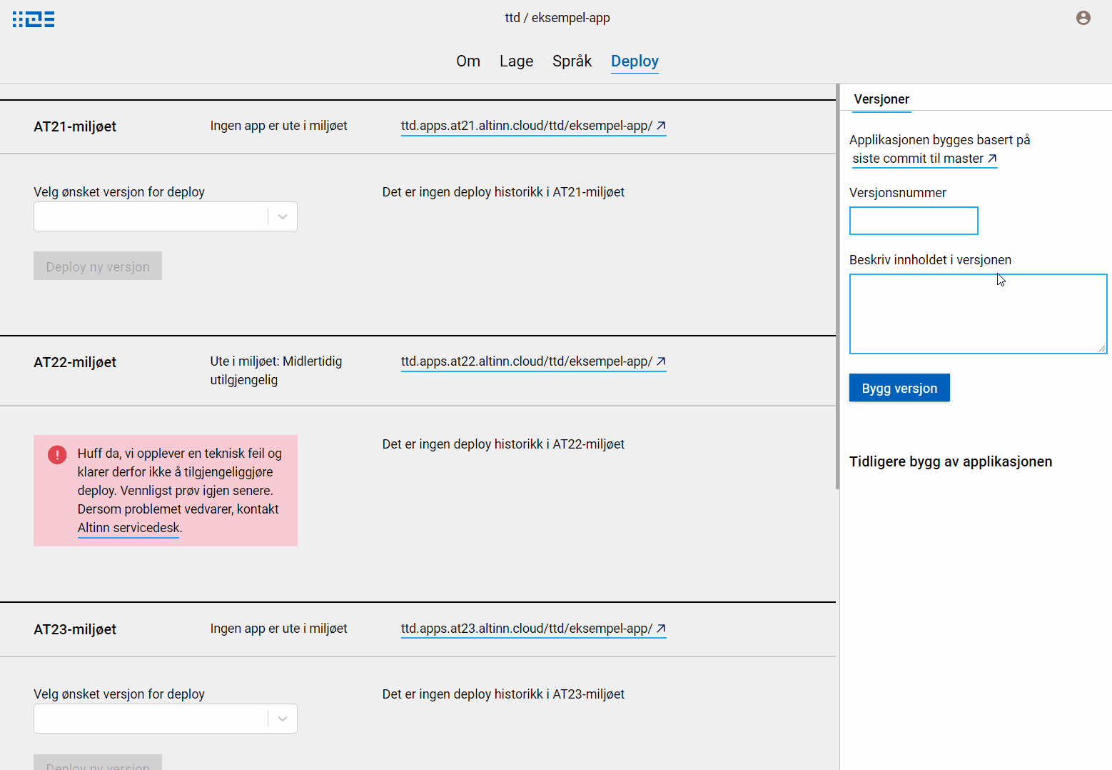 Når en app er klar til test, kan den bygges ved å gå til Deploy-fanen i Altinn Studio (inne på den appen som skal deployes).