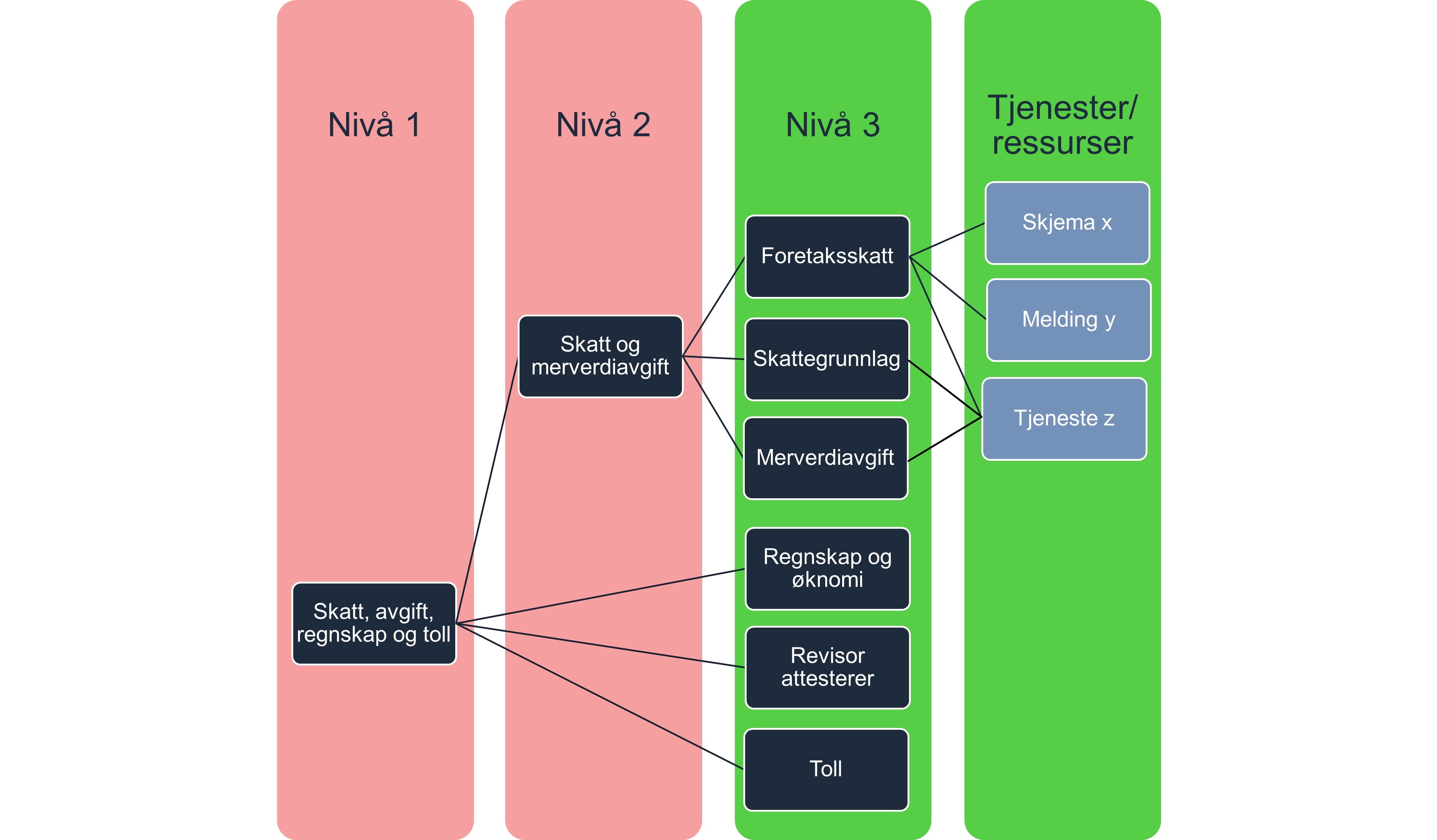 - Tjenester/ressurser knyttes alltid til laveste nivå (grønn boks)