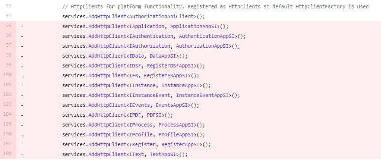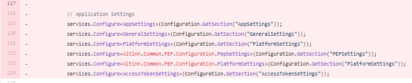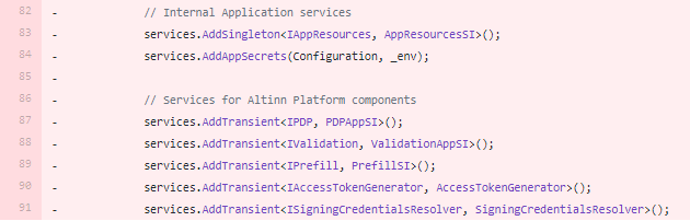 services.AddAppServices(Configuration, _env); services.AddPlatformServices(Configuration, _env);The code that should be removed from the file is marked in pink in the pictures below, which cover one section of the file each.