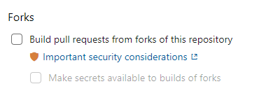 Disabling of secret sharing on repo forks are done by navigating from the pipeline to Triggers and selecting the github integration under “Pull Request Validation”. Here you can disable secret sharing by disabling the build on forks.