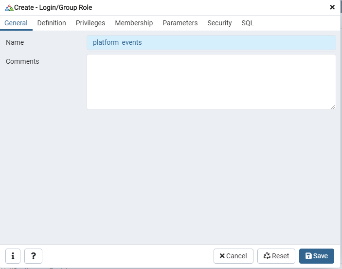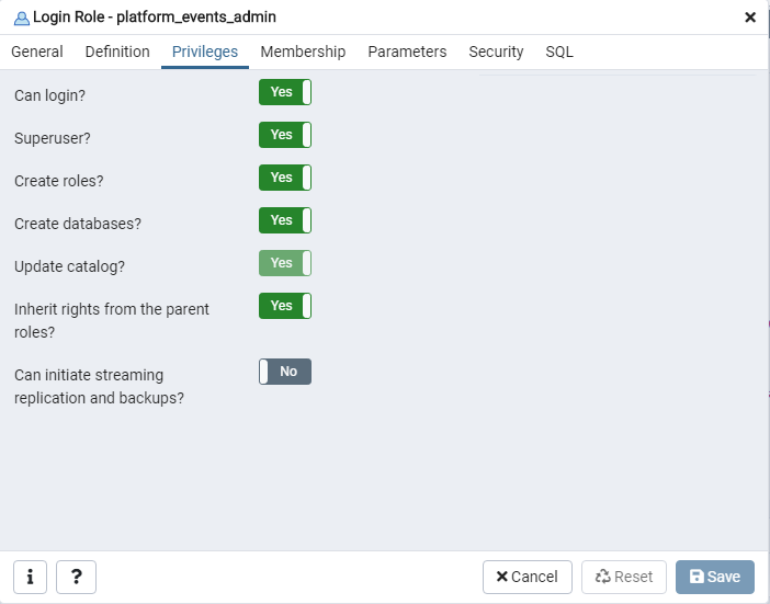 GRANT SELECT,INSERT,UPDATE,REFERENCES,DELETE,TRUNCATE,REFERENCES,TRIGGER ON ALL TABLES IN SCHEMA events TO platform_events;