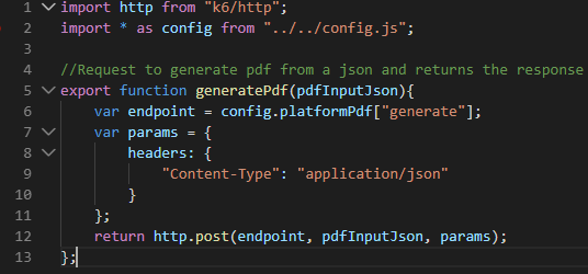 Create a new method for the actual api in a .js file under folder K6/src/api which gets in data from the tests and returns response. Refer below picture for a sample method calling an api with endpoint and headers and returning the response.ApiCall Example