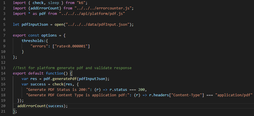 Create a test .js file under K6/src/tests. Refer below picture for a sample test file.Tests ExampleMore about k6 test scripts