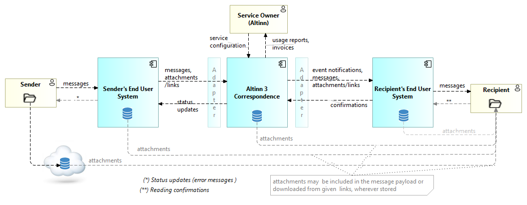 The following diagram gives a high level overview of Altinn 3 Correspondence actors and information flow.