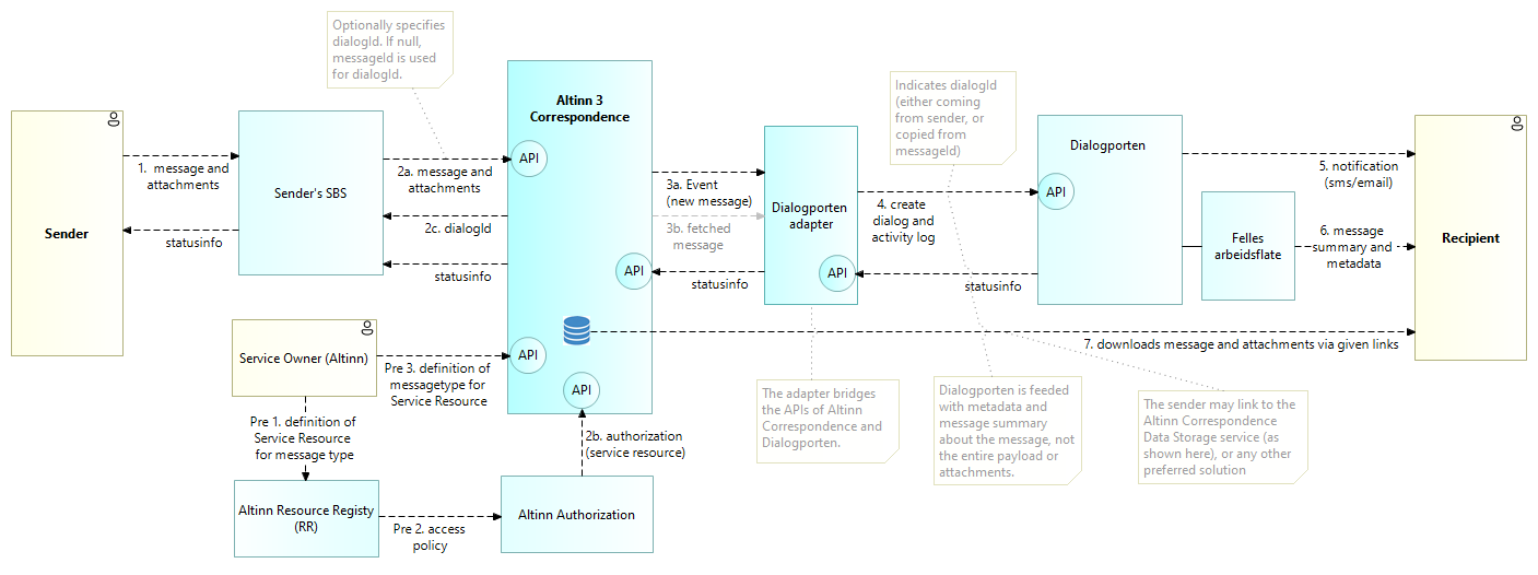Altinn 3 Correspondence solution architecture for basic use cases of Managed File Transfers.