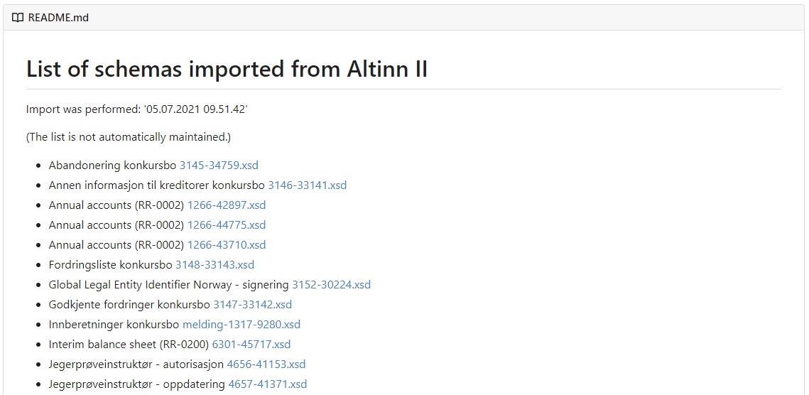 I tillegg vil du se en readme.md fil som vises på forsiden av repository. Denne inneholder en tekstlig beskrivelse av alle XSD’ene som er hentet ut fra Altinn 2.