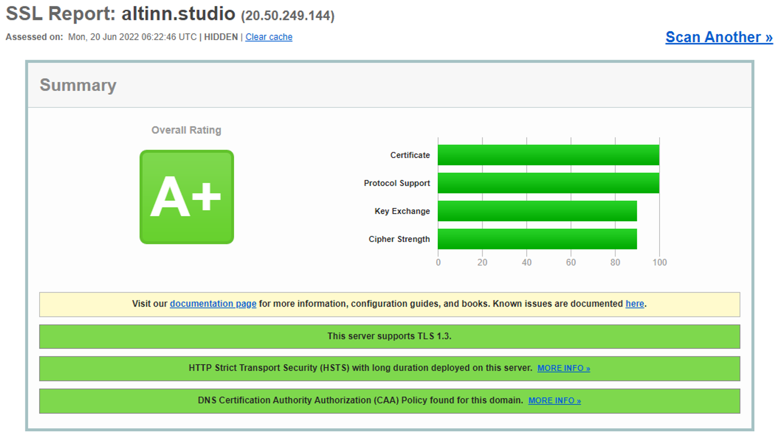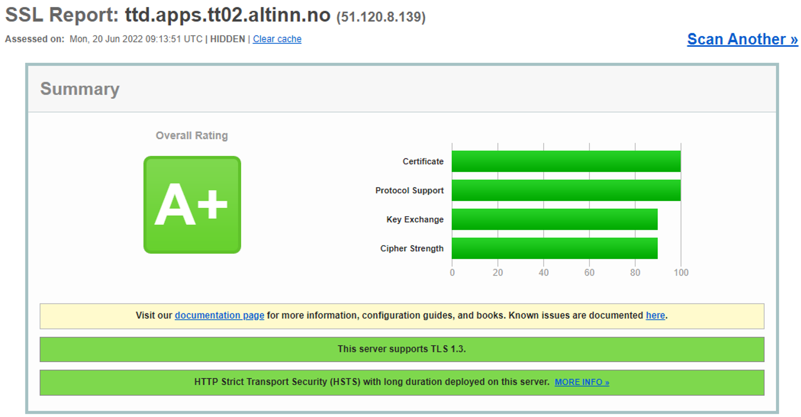 HTTP traffic is encrypted with TLS 1.2 (or TLS 1.3 where available). Qualys SSL Labs is a tool that checks and grades the SSL/TLS setup of websites. Figures 4 and 5 show the results of Altinn Studio and an Altinn Apps cluster.