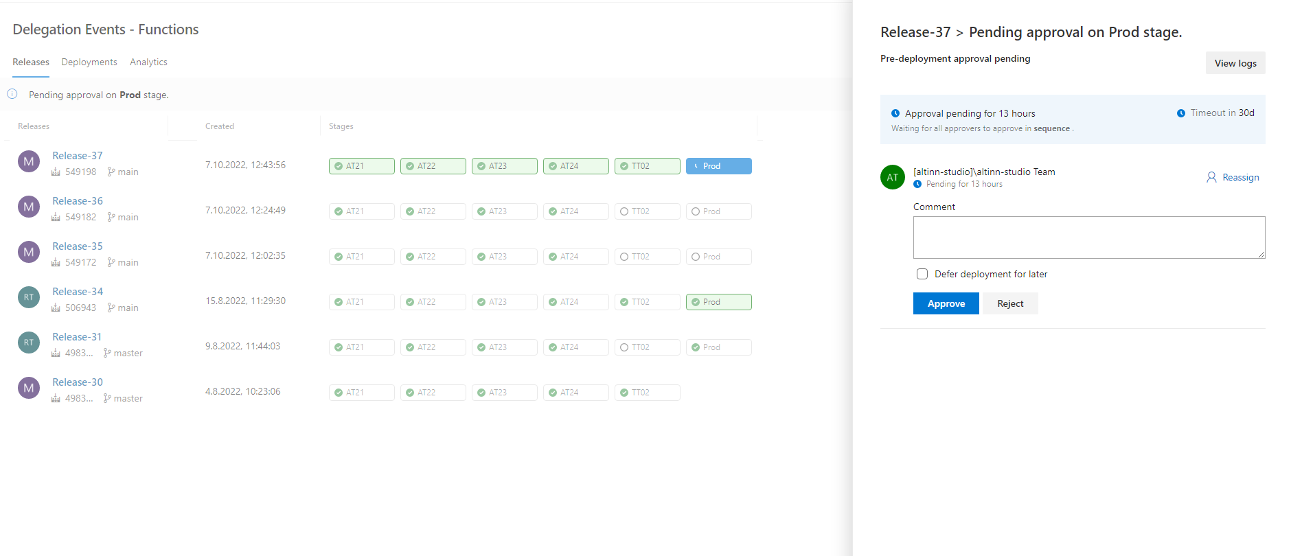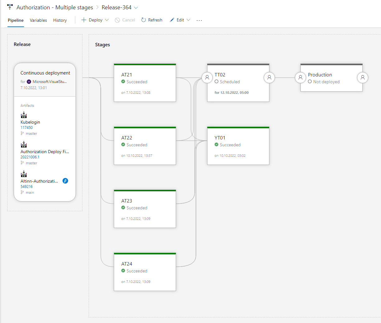 From the Release Pipeline Dashboard, the DevOps team can see releases. For example, in the below screenshot, you see info about release 364 of the Authorization component.