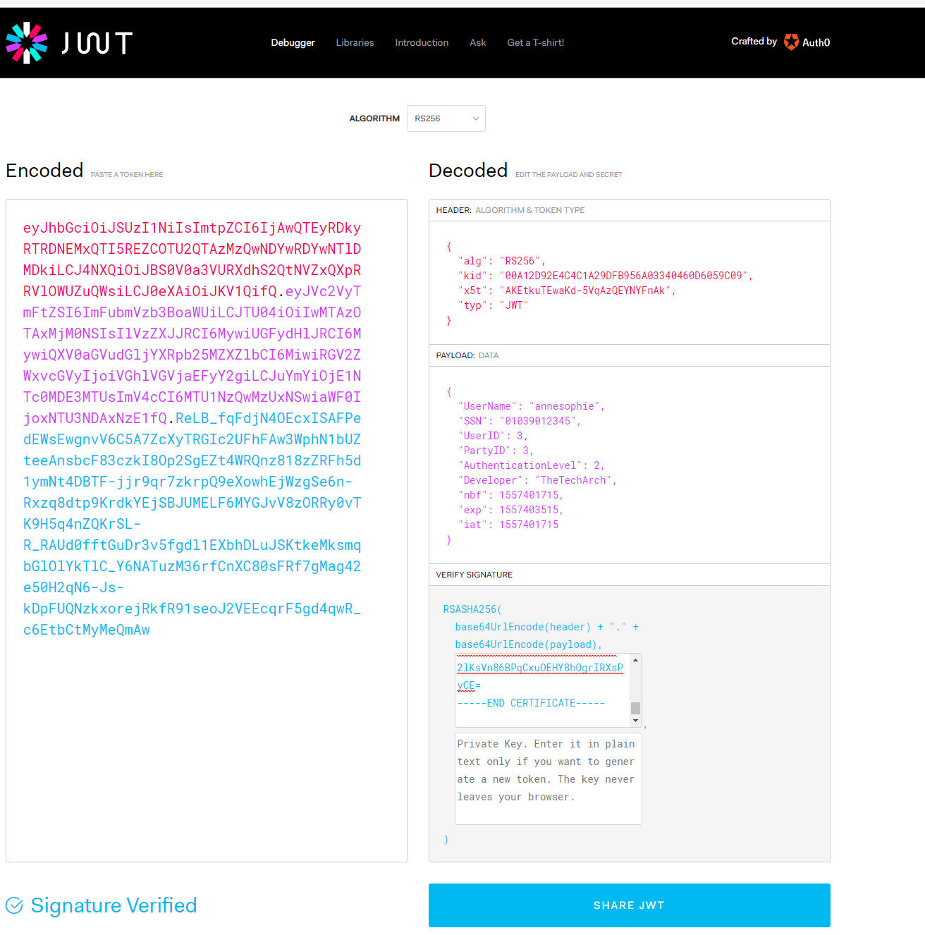 The below screenshot shows how a JWT Token can be verified at jwt.io